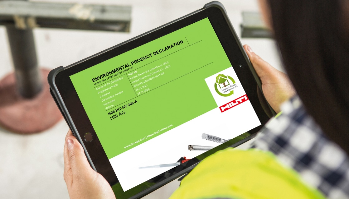 Com documentação de terceiros disponível para mais de 1.500 produtos, a Hilti oferece dados pensados para apoiar esforços de certificações e ajudar projetos a demonstrar seu impacto de sustentabilidade.